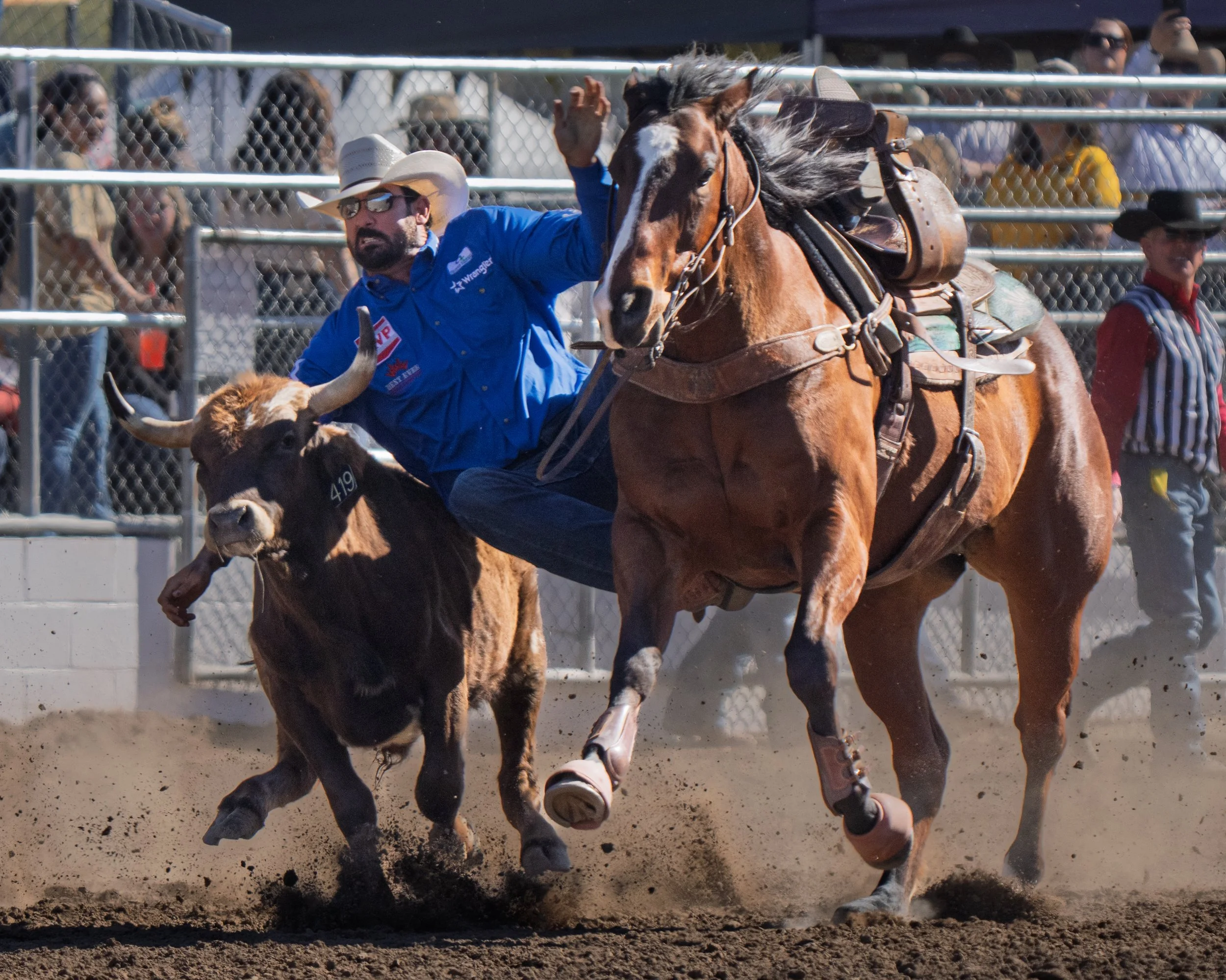 Speed and strength define steer wrestling, the fastest event in rodeo with a world record of just 2.4 seconds. In this event, also known as bulldogging, the cowboy, or "bulldogger," must use both power and technique to bring a steer to the ground as quickly as possible. Although the task sounds straightforward, the challenge increases significantly due to the steer’s weight—more than double that of the cowboy—and their combined speed of 30 miles per hour.