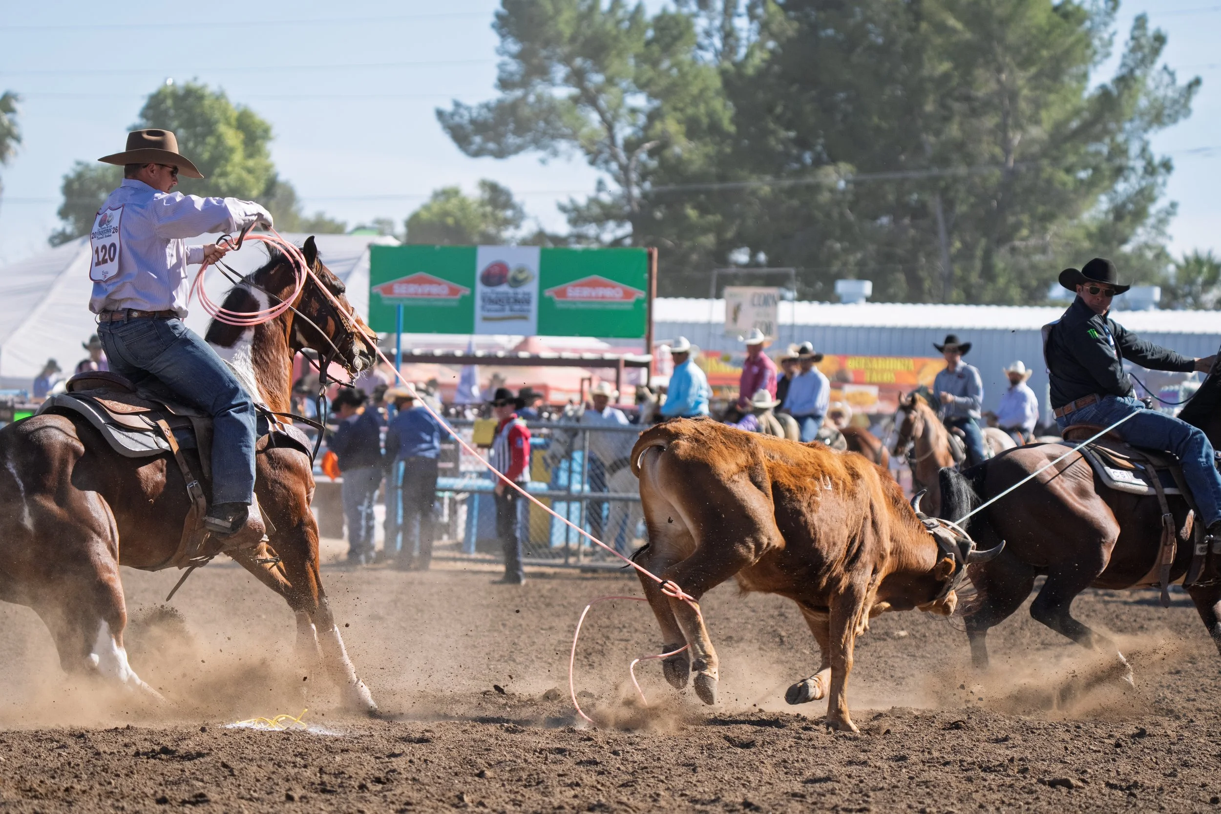 The header aims to make one of three legal catches on the steer: around both horns, one horn and the head, or the neck. Any other catch results in disqualification. Once the header secures the catch, he turns the steer to expose its hind legs to the heeler, who attempts to rope both legs. A five-second penalty is given if only one leg is caught. The clock stops when there is no slack in the ropes and the horses face each other. American quarter horses are popular for this event; heading horses are taller and heavier for power, while heeling horses are quick and agile to follow the steer's movements.